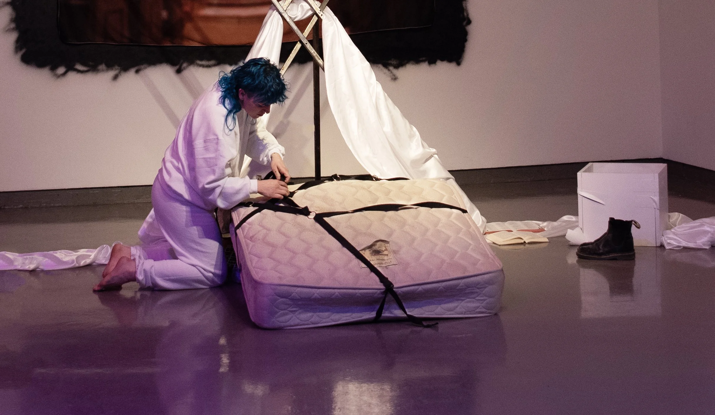 The Beginning Performance, still, 2023. Ernest G. Welch School Of Art & Design Gallery, Atlanta, Ga. Photograph by Rachel WarrenI lift the soft structure onto my back and slowly carry it from the St. Andrews cross; I stop at each sculpture as if walking back through each memory juxtaposed with the actual journey from my bathroom, to running away to Sky’s house, to arriving at the ER, and then the psych wards the next day. As I cross back through this path a trail of rocks and awakening literature is revealed. Stopping one last time at Split to the bone before exiting I’m placed in the cold bathroom, mopping up the evidence of the act I’d hoped to never share with the rest of the world. I take a deep breath and exit the gallery into the lobby where there is no longer a boundary between me and the voyeurs.